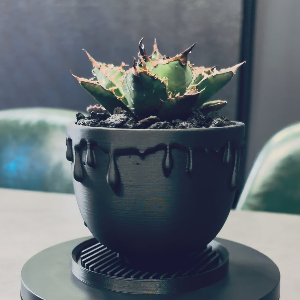 縁から滴り落ちる立体的な造形が、置くだけで空間を引き締めるアートピースの存在感を生み出します。