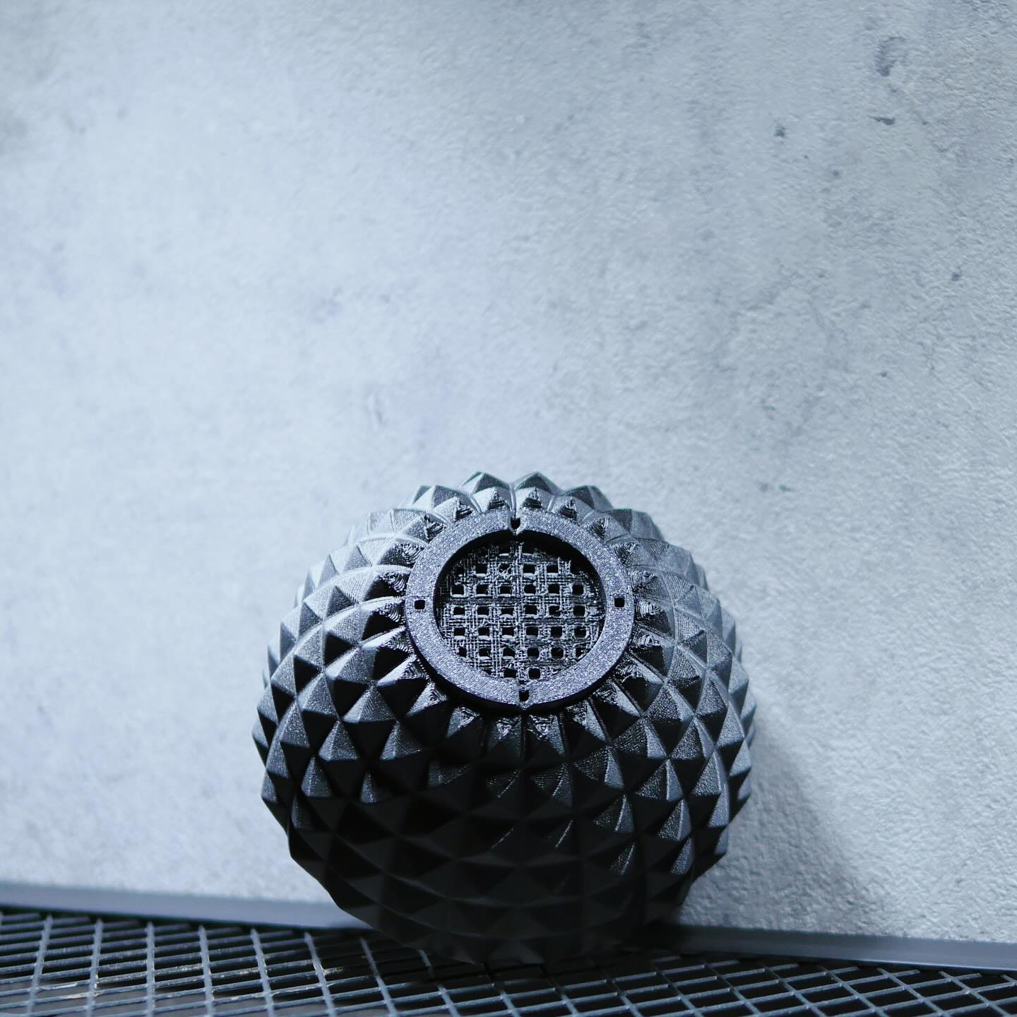 外側には無数の多面スタッズを敷き詰め、光の角度によって立体的な陰影を形成。マットブラックとスタッズパターンが合わさることで、植物と空間に力強い存在感を生み出します。